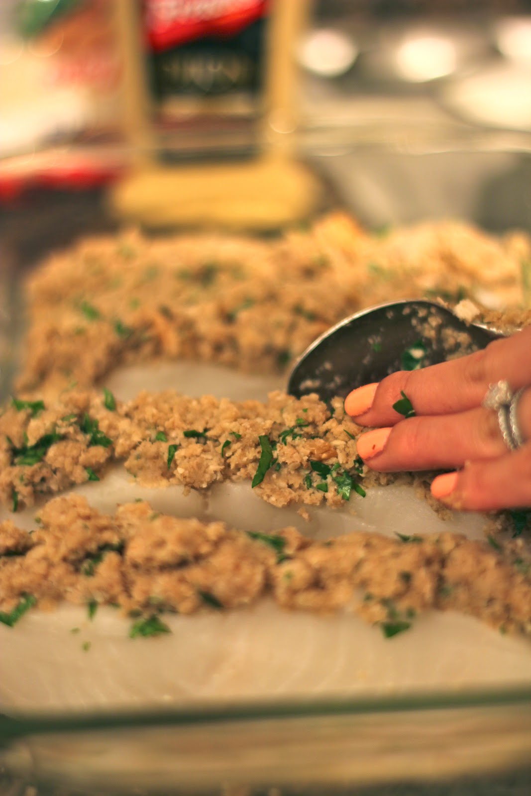 Baked Sea Bass with Walnut-Breadcrumb Crust with Lemon Dill Sauce
